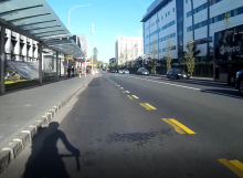 Road surface pushed up by buses, creating a large ridge parallel to kerb (approx. 1.5m out from kerb). This is a trip hazard for peds and a hazard for cyclists, scooters and motorcyclists. Two hospital visits have resulted from this hazard (2014-2016). Still no action from AT on a permanent repair.