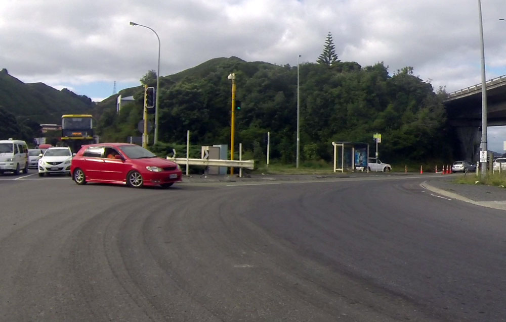 Car coming down Centenntial Highway illegally turning left onto SH2 on ramp, cutting off a number of cyclists who were crossing the road on a green light
