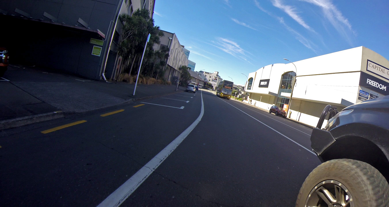 I crossed the intersection on the cycle lane into Thorndon Quay when a Ute passed my extremely closely making me swerve and pushing me onto the shoulder.