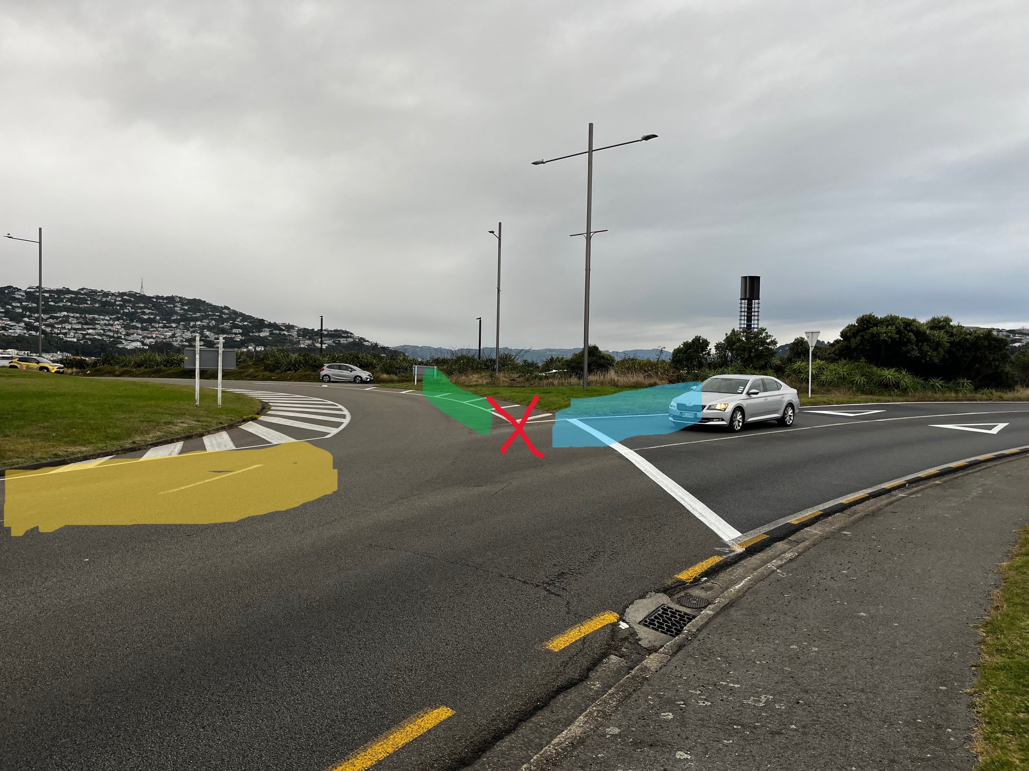 At the round about before Akau Tangi, the cyclist was in the roundabout coming from Evans bay Marina turning right and going to exit to Rangotai. The white car in the right lane sped through and crashed into the bicycle which was coming round the roundabout.