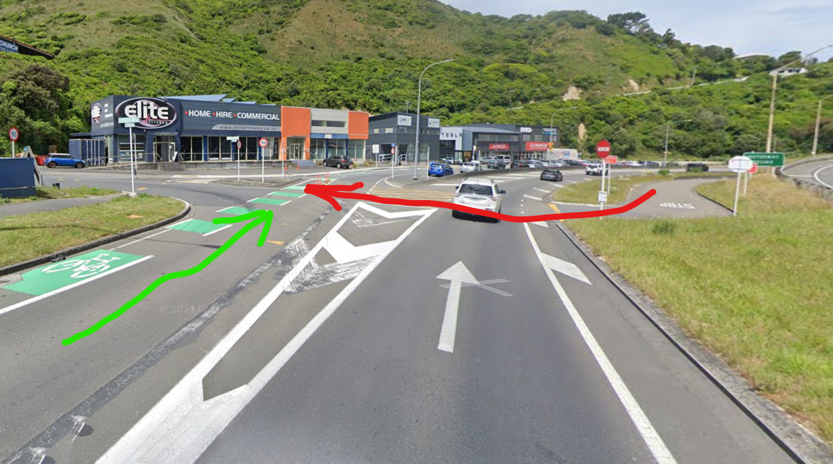 Heading down Ngauranga gorge at speed and a car cut in front of me to go straight through to Glover Street. Traffic was at at a standstill in the right lane due to a crash on SH2. Both the driver and I had to take evasive action. Later he blamed me and said slow down, too fast despite not giving way.